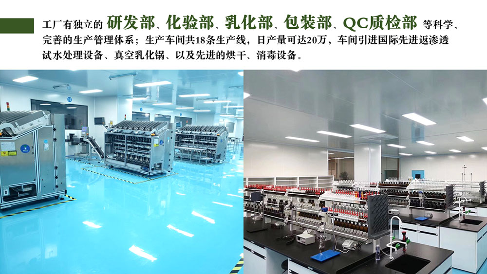 3.灌装车间:①安瓶灌装机,精度+-0.05%、自动放管、灌装、压塞、顶出等;②水乳灌装机:配套两套灌装系统,自动调瓶模、自动翻转180度吹瓶(6套日本进口负离子防静电除尘系统) ;③膏霜灌装机,转盘式的灌装机,进瓶速度快、性能稳定可靠,日产能8小时25000瓶;④高速全自动面膜灌装封口机,自动压膜、自动称重、自动数一体化全触摸+PLC控制设备,年产面膜2亿片。