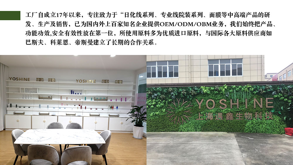 上海遇鑫生物科技有限公司是专业生产国内外高端护肤、洗涤类的化妆品加工OEM/ODM专业供应商,专业从事化妆品加工生产研发15年。上海遇鑫爱体育网占地30亩,建筑面积30000多平方米,员工300-500多人。拥有10万级净化车间以及30万级包装车间,18条自动流水线。生产车间完全按照GMPC国际标准设计建造,通过ISO9001、ISO14001、GMPC、欧盟ISO22716(GMP)等多项国际认证,属于全球美妆基地上海东方美谷104工业板块,并拥有一流通风净化系统。研发团队有国外一流的韩国化妆品研发专家和国内资深十多年开发经验的工程师参与研制配方及开发产品。可以自主研发国内外各种高端护肤洗涤类等高新化妆品项目,原料供应商分布国内外,包括瑞士,日本,韩国,美国,德国,法国等原产地的顶级原料商。公司有花园式工厂、现代化生产链、人性化管理模式,及学习型组织使每一位遇鑫员工活力四射、朝气蓬勃。